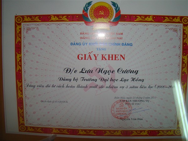 Hai đồng chí vinh dự được nhận bằng khen đảng viên đủ tư cách, hoàn thành xuất sắc nhiệm vụ 05 năm liền của Tỉnh ủy Đồng Nai gồm đ/c Trần Hành-Hiệu trưởng nhà trường và đ/c Đào Thanh Mai-UV.BCH Đảng bộ trường. Ngoài ra, cũng trong dịp này Đảng ủy khối Dân chính đảng tặng giấy khen cho 02 đảng viên đủ tư cách, hoàn thành xuất sắc nhiệm vụ 03 năm liền (2008-2010) gồm đ/c Lưu Ngọc Cương-đảng viên chi bộ 2 và đ/c Trần Thị Yến Phương-UV.BCH Đảng bộ trường.