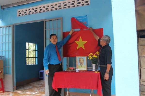 Hình 2: Lãnh đạo nhà trường trao tặng căn nhà cho ông Chuyến