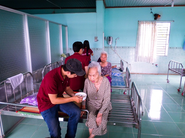 Hình 3- Bạn Bùi Nguyễn Hoàng My- đang đút cơm cho các cụ tại viện dưỡng lão
