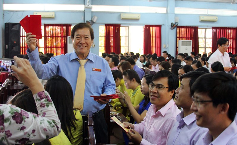 Thầy Phó Hiệu trưởng trao lì xì may mắn cho cán bộ, giảng viên, nhân viên
