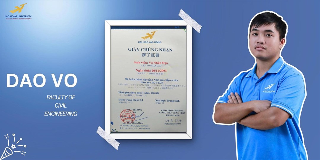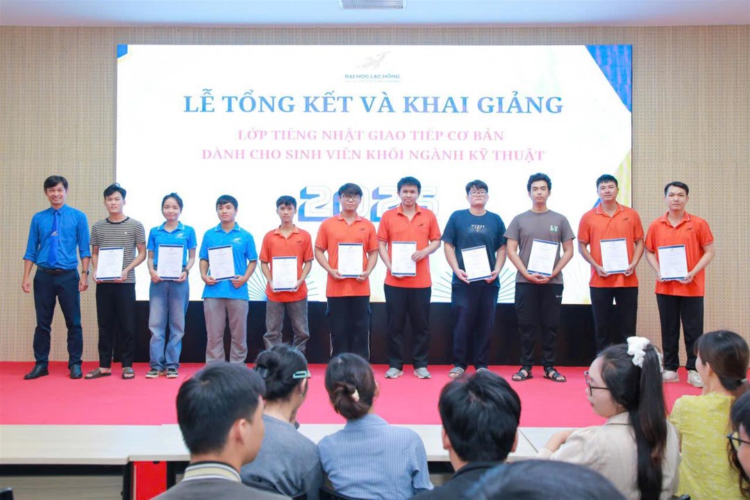 Chúc mừng sinh viên Khoa Kỹ thuật Công trình nhận chứng nhận hoàn thành khóa học Tiếng Nhật giao tiếp cơ bản. Ngày 20/9/2025, Trường Đại học Lạc Hồng (LHU) đã long trọng tổ chức Lễ Tổng kết & Khai giảng lớp Tiếng Nhật giao tiếp cơ bản khóa 11 (2024–2025). Đây là một trong những chương trình ngoại ngữ được nhà trường triển khai thường xuyên, nhằm tạo điều kiện cho sinh viên rèn luyện năng lực ngoại ngữ song song với chuyên môn.