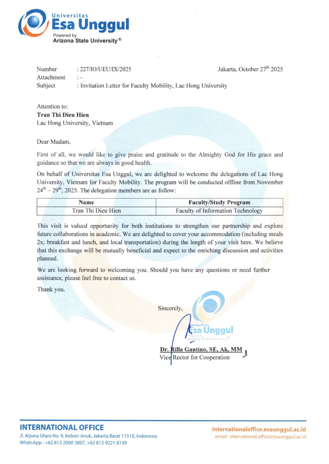 Giảng viên LHU được ESA Unggul (Indonesia) mời tham gia chương trình Faculty Mobility