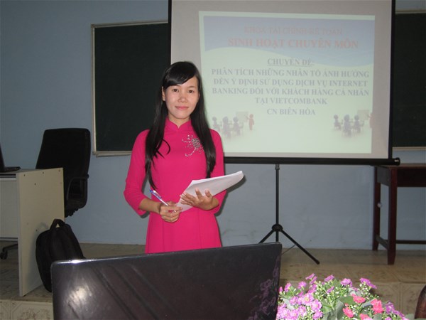Đại diện Tổ bộ môn Lý thuyết tài chính tiền tệ, Cô Đoàn Thị Hồng Nga đã trình bày chuyên đề với một số những nội dung chính bao gồm: phân tích thực trạng khách hàng sử dụng dịch vụ Internet banking tại Vietcombank Chi nhánh Biên Hòa, tìm ra những nhân tố ảnh hưởng đến ý định sử dụng dịch vụ Internet banking thông qua mô hình nghiên cứu và xử lý số liệu bằng phần mềm SPSS 20.0. Từ các nguyên nhân và hạn chế từ thực trạng tại ngân hàng cùng với kết quả nghiên cứu, chuyên đề đưa ra một số giải pháp nhằm phát triển dịch vụ Internet banking trong thời gian sắp tới.