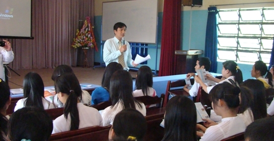 Ths. Nguyễn Vũ Quỳnh giới thiệu đôi nét về những điểm mới trong tuyển sinh 2010 và những thông tin về trường Đại học Lạc Hồng tại trường THPT Thống Nhất B