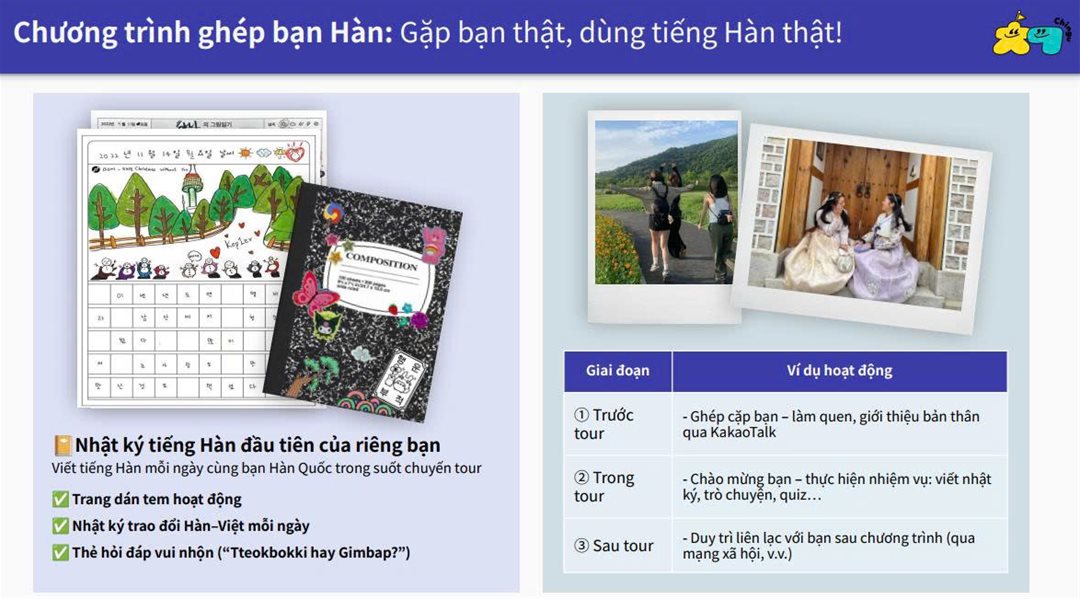 • 👥 Ghép cặp với bạn Hàn Quốc – trò chuyện, viết nhật ký song ngữ, tham gia thử thách cùng nhau.